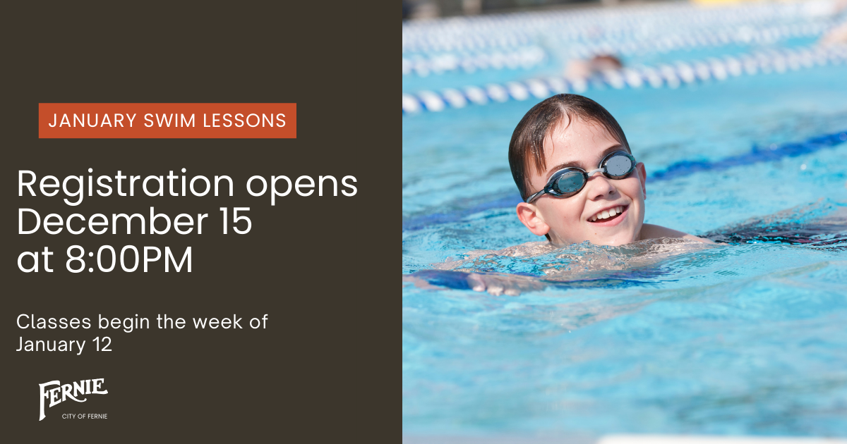 Swim Lesson Registration opens at 8:00 PM on December 15 for classes beginning the week of Janaury 12, 2026.